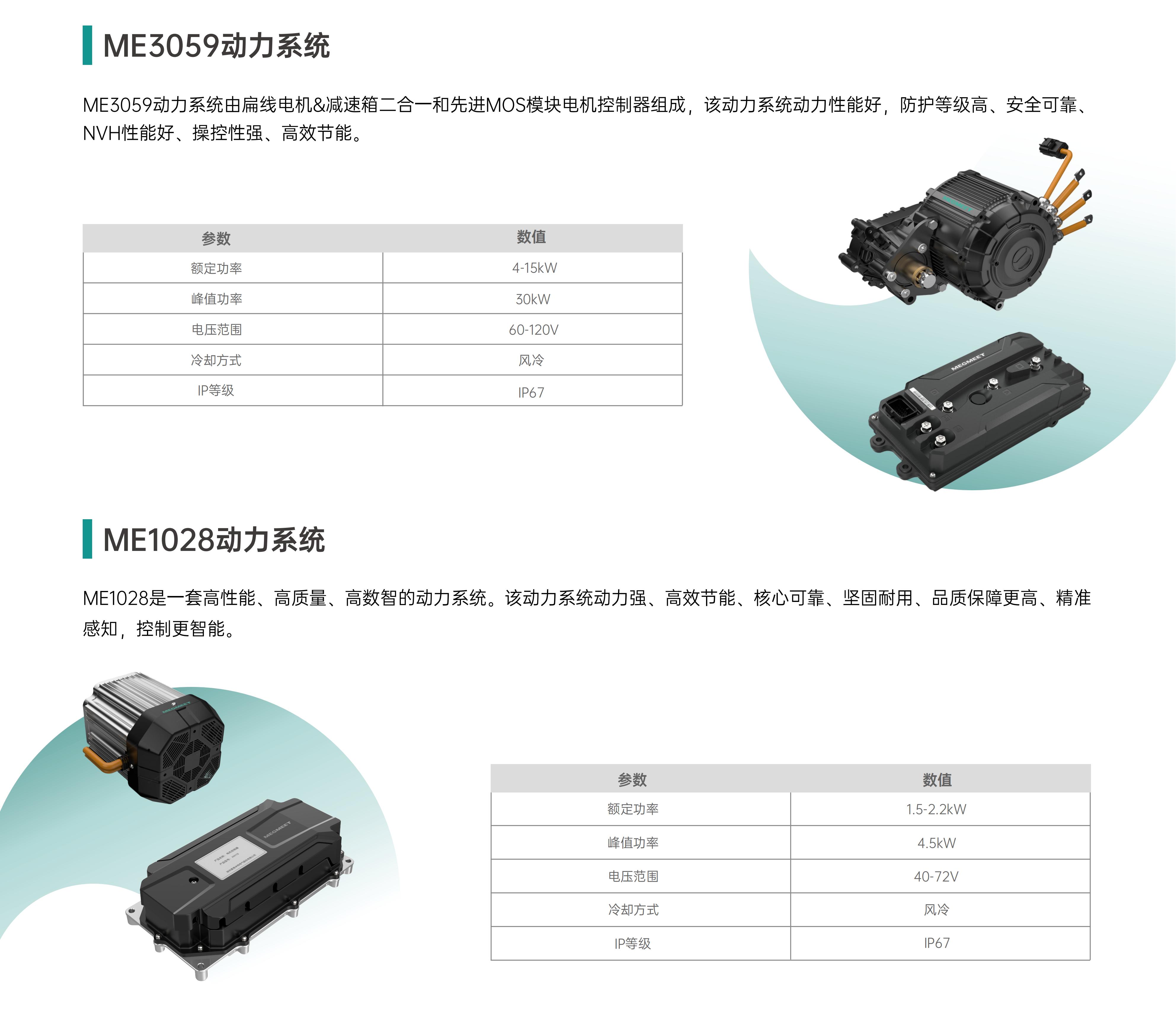 動力產(chǎn)品包括電機控制器、電機、二合一電機(電機+減速箱)、三合一動力系統(tǒng)(電機+減速箱+電控)等